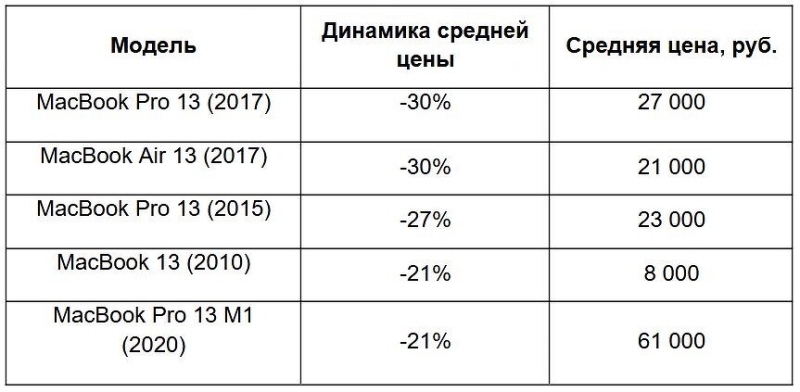 На 27% за год подешевел MacBook Pro 13 2015 г. Его в среднем можно было купить за 23 тыс. руб. Далее идет модель еще старше — MacBook 13 2010 г. За год она потеряла в цене 21%. Купить ее можно было в среднем за 8 тыс. руб. Топ-5 по падению цен замыкает модель 2020 года MacBook Pro 13 M1. Ее стоимость снизилась также на 21%, в среднем она продавалась за 61 тыс. руб.