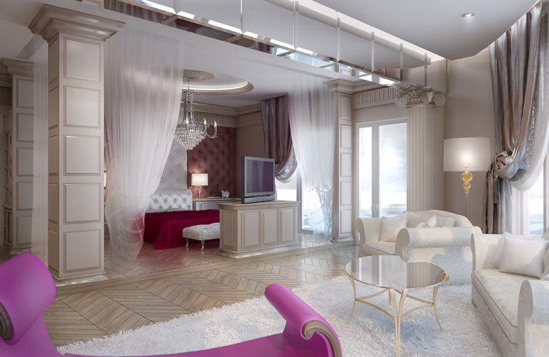 - Потолок с полом – белые, светлые стены, например, в беже, перламутре, жемчуге/серебристом с черной мебелью/венге, а также белоснежным текстилем.