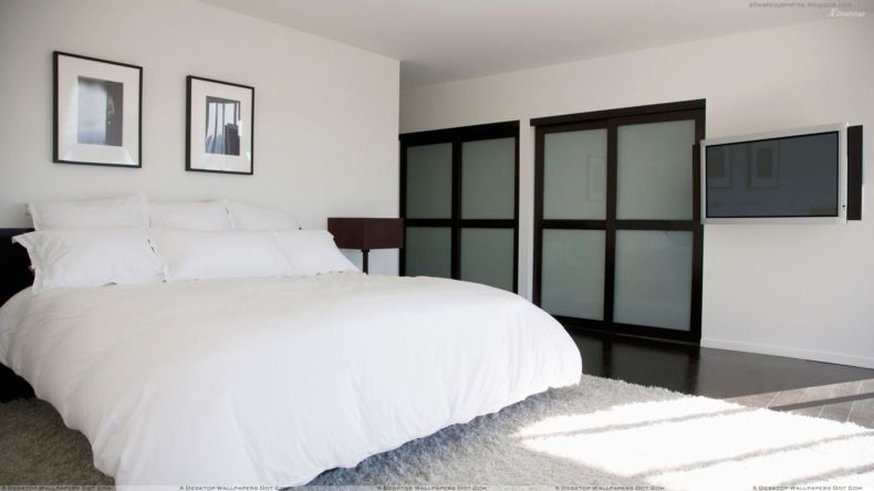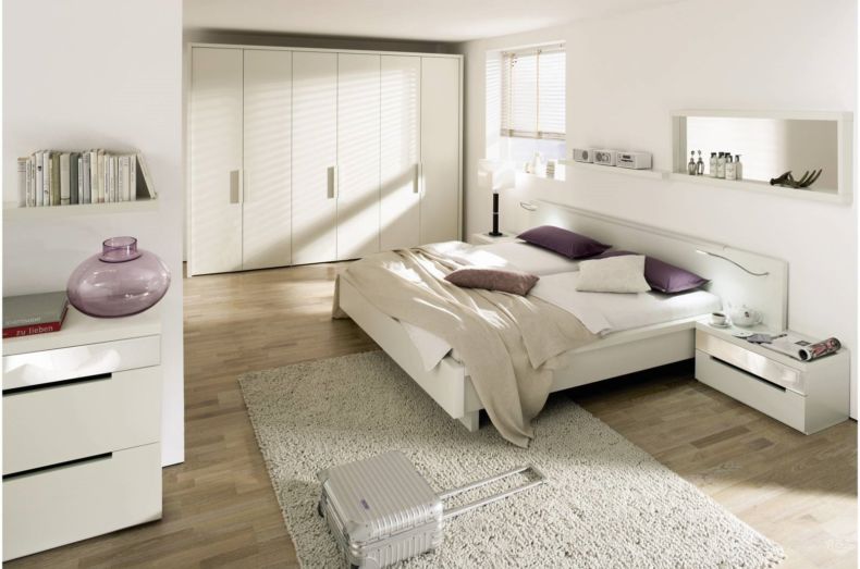 - Стены с белой мебелью для спален сочетаемы с темным паркетом, а также коричневым/беж текстилем.