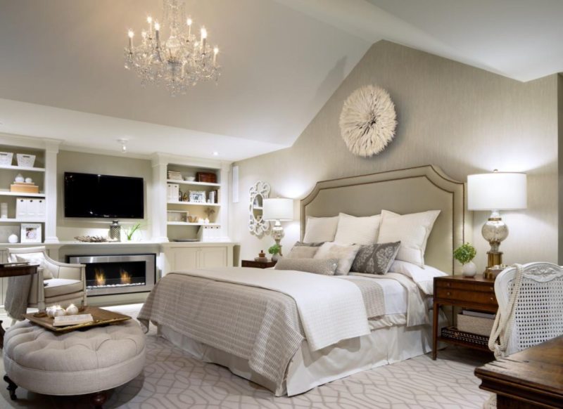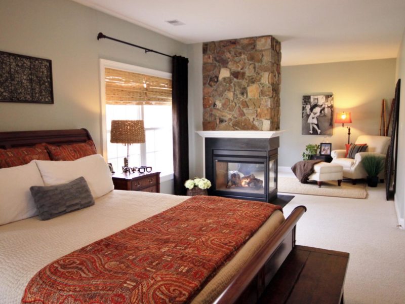 Что касается камина, то он отлично впишется в помещение с любым оформлением, главное только изначально оформить планировку большой спальни под этот элемент, ведь он является главным украшением и акцентом, который уж точно не останется без внимания.