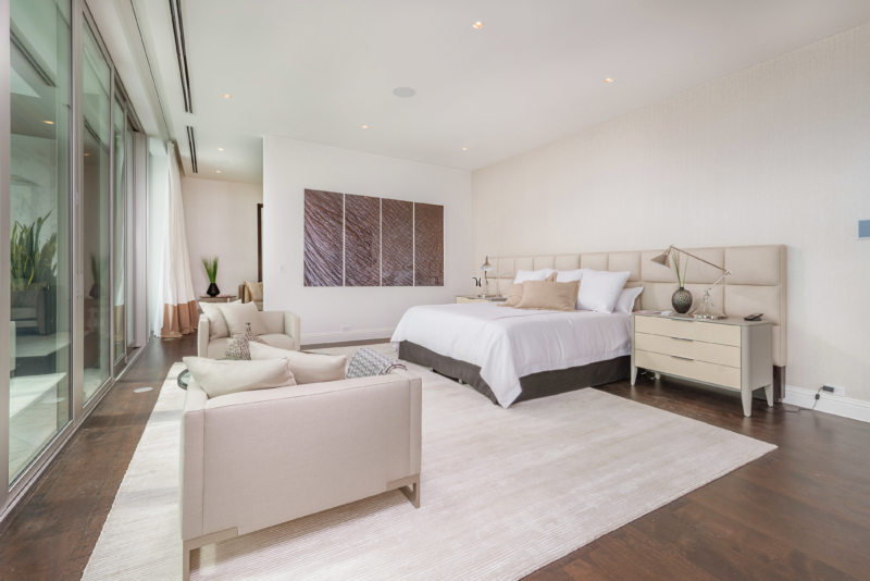 Львиная доля мастеров при оформлении спален внушительных размеров сразу представляют лаконичный стиль с максимальным сохранением свободного места.