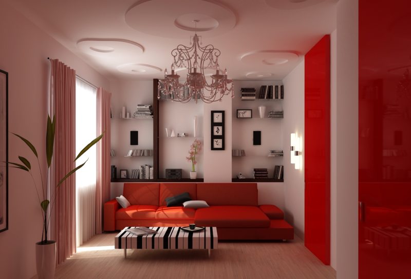 Бордовый цвет отлично сочетается с белым. Если гостиная хорошо освещена, то белый цвет придется очень кстати. Такая комната будет заряжать вас энергией, придавать уверенности.