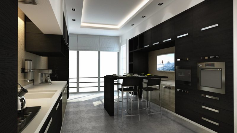 Шикарной Вашу кухню смогут сделать потолок, стены и гарнитур в черных тонах. Главное напольное покрытие подобрать молочного цвета.