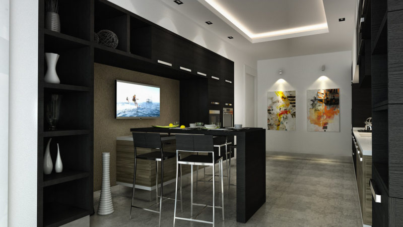 Если помещение небольшое в этом случае современный дизайн кухни в чёрном цвете предусматривает использование барной стойки. Это станет не только удачным применением, но максимально сэкономить немного площади и так небольшого пространства.