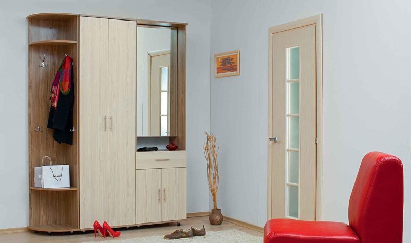 Обычно это комплект из одностворчатого шкафа, зеркала, которое поможет осветлить и расширить пространство, вешалки для одежды и двух тумб. Он поможет не только украсить пространство, но и сэкономить его.