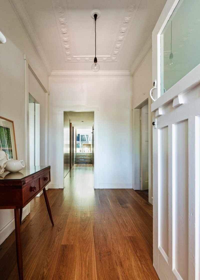 Сделать коридор светлым поможет белый цвет. Но выбирают его не всегда, ввиду непрактичности. Специалисты в этом случае советуют сочетать белый с другими цветами. Получится очень уютно и стильно.