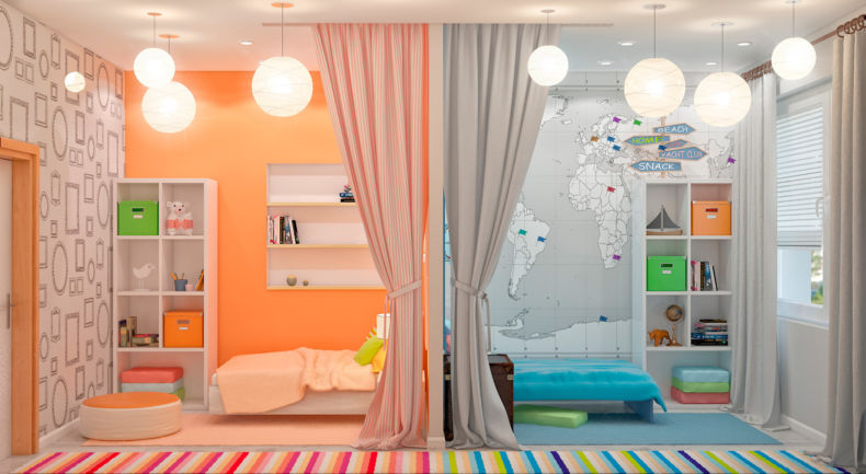 На пункте возрастная категория и интересы ребенка не будем заострять внимание. Стоит все же уделить особое внимание зональному делению, в которых будут обитать двое одно/двуполых деток. Каждому нужно организовать место для сна и отдыха, для уроков, систему хранения, зону для игр, творчества. Очень важно умудриться, все максимально уместно организовать в одной комнате, при этом интерьер не должен выглядеть как-то перегружено. В свою очередь каждый ребенок сможет проявлять активность по-своему.