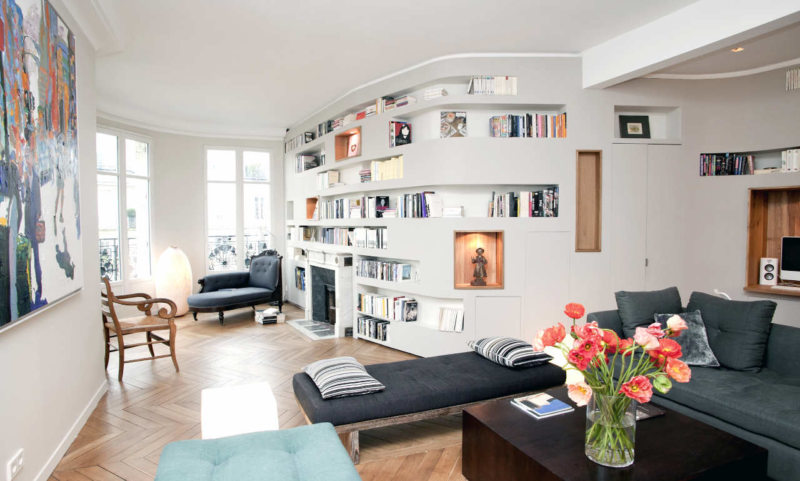 Узкие высокие стеллажи вместят в себя мелкие предметы декора, книги, фотографии. Такие предметы интерьера лучше всего устанавливать по углам комнаты. В спальную зону можно установить пуфы с ящиками для хранения вещей.