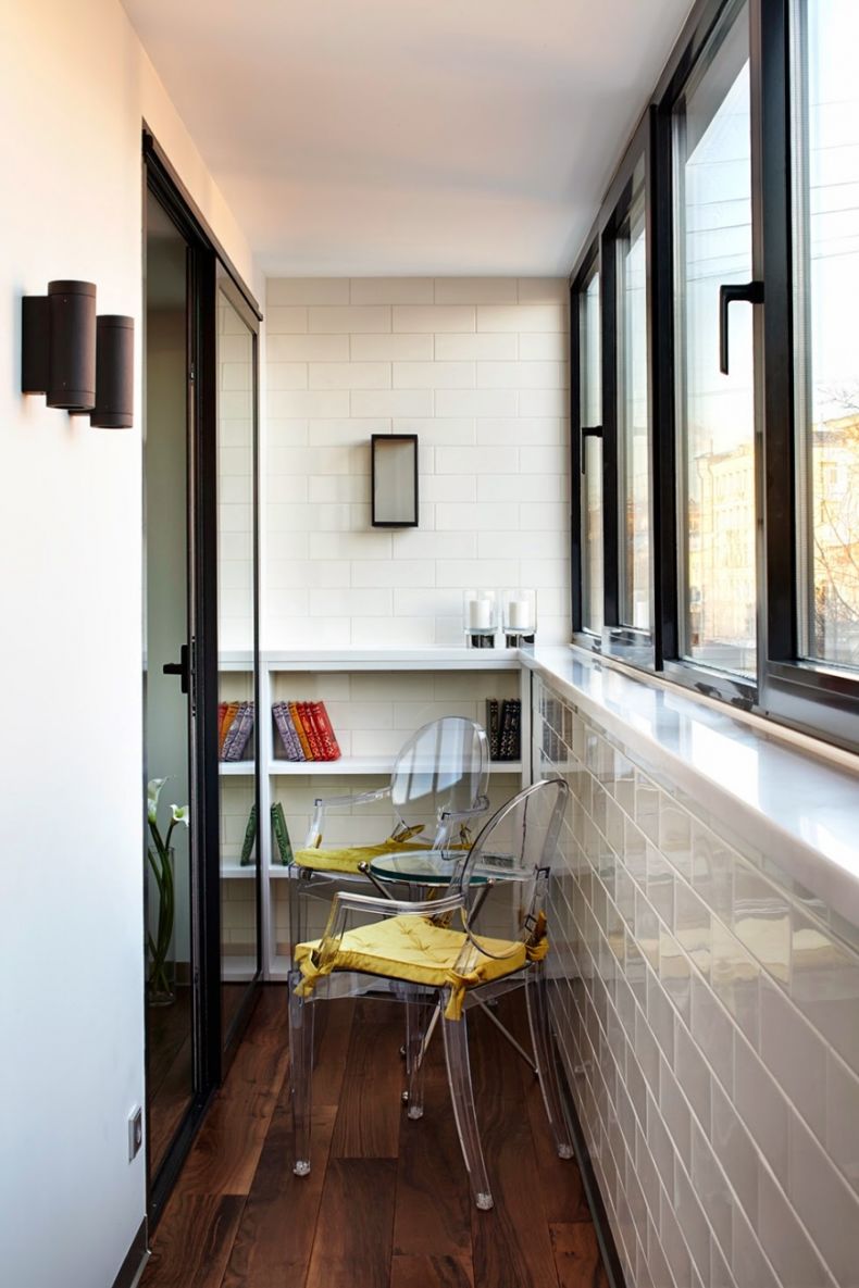 Обычно такие балкончики захламляются быстрее всего, так как на них особо не разгуляешься. Но не стоит отчаиваться, решение всегда найдется. К примеру, можно устроить небольшие шкафчики, задрапировав их под сидения, а откидной столик пристроить к стене.