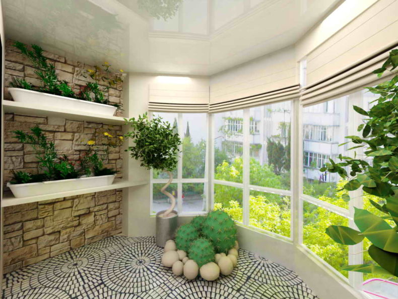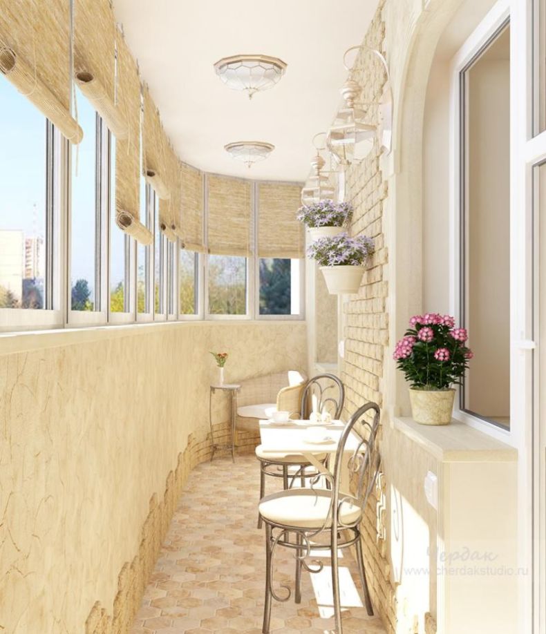 Дизайн отделки лоджии требует тщательного подбора материалов, главное не переборщить с количеством предметов. Теперь важно учесть все свои желания и реализовать их на практике. Можно устроить цветочную галерею, подвесив на стены изящные кованые кольца для цветочных горшочков.