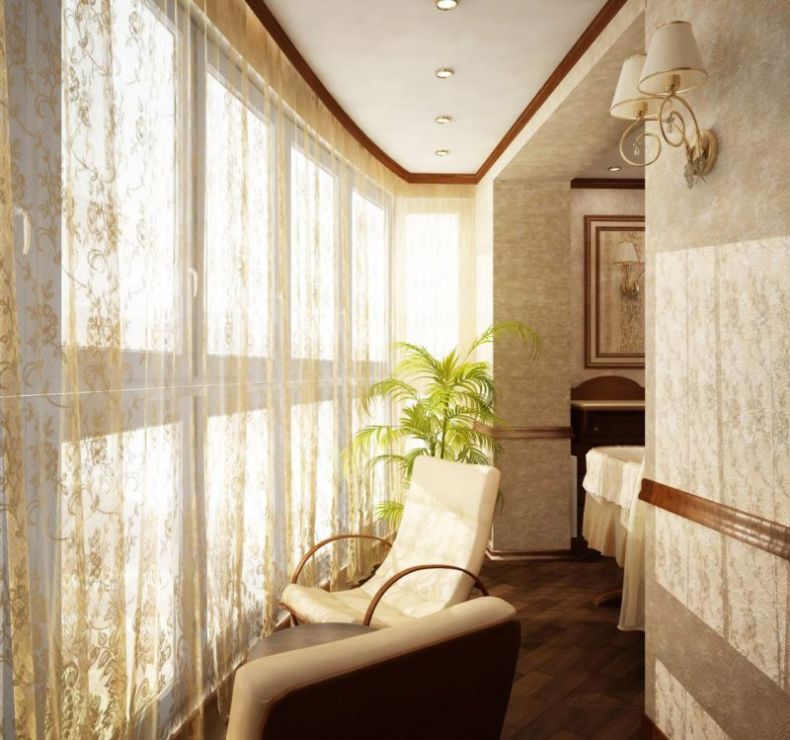 Полупрозрачные занавески с простым орнаментом, впустят море света и тепла. Для отделки полов, как можно увидеть из фото дизайна лоджии, использовать покрытие под ясень, клен, каштан, бук. Такие сочетания позволят визуально расширить пространство, и снять напряжение после трудового дня.