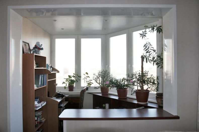 При объединении можно просто снять двери и окна, не затрагивая несущего каркаса, а оставшийся подоконник стилизованно оформить под интерьер гостиной, спальни или кухни, расположив на нем телефон, книги или мини бар. Затруднение могут составить лишь документальные вопросы, связанные со сносом несущих конструкций.
