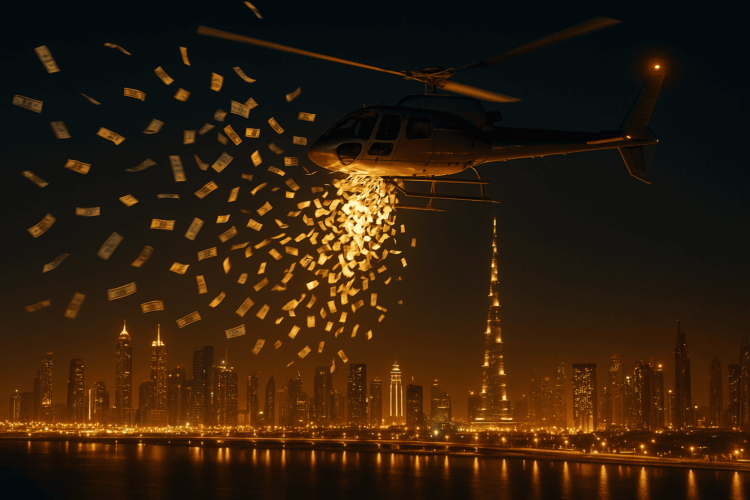 В Дубае бывают особенные дожди — не из воды, а из купюр и золотых слитков. В праздничные дни шейхи могут устроить настоящее шоу, сбрасывая деньги с вертолётов прямо на улицы. Представьте: с неба падают деньги, и их можно подбирать. Один из таких полётов в 2020 году «посеял» 1,5 миллиона долларов на улицах города. Но зачем они это делают и что на самом деле стоит за этими блистательными жестами: безумие, демонстрация щедрости и богатства,тщательно продуманная традиция или что-то ещё?