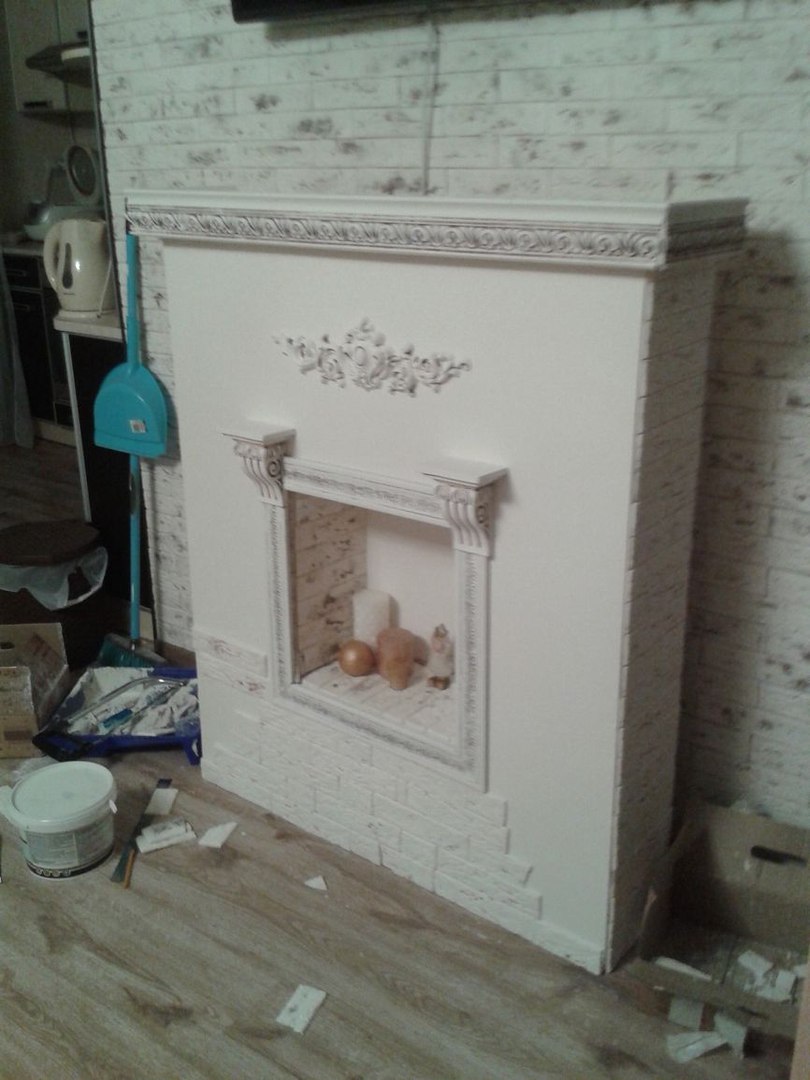 Чтобы выполнить такой вариант камина, нужен магазинный полиуретановый портал, контактный вид клея, шпаклевки, отделочных материалов для топки вроде декоративного кирпича.