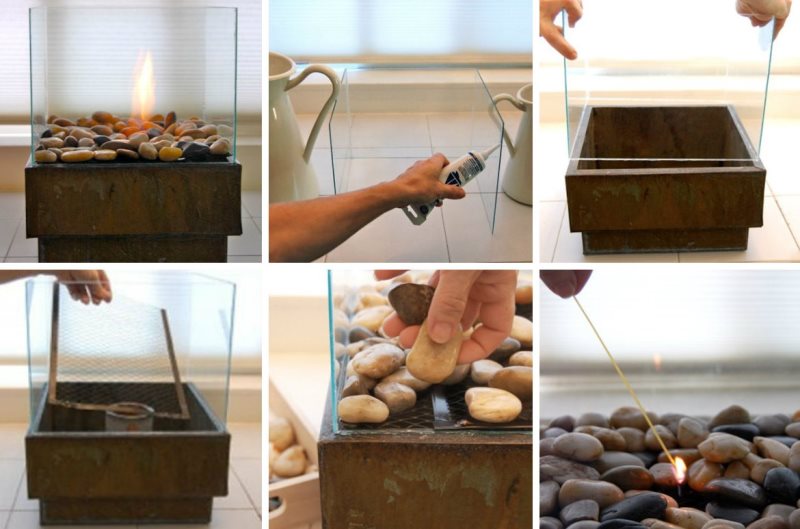 Если электрический камин устанавливать Вы не собираетесь, задекорируйте заднюю часть Вашей конструкции при помощи зеркала. На днище уложите задекорированные поленья/засыпьте его камнями, ракушками, шариками из стекла.