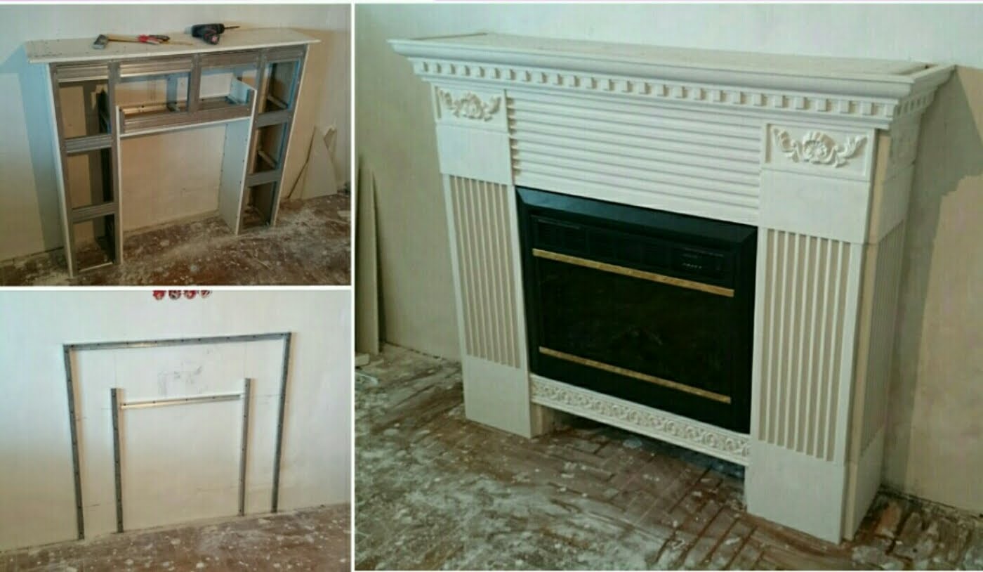 Каркас делается из профиля, его элементы соединяются между собой саморезами. Профиль режется ножовкой/ножницами. Чтобы все элементы были наиболее устойчивыми, их следует соединить поперечными видами перемычек. Если Ваша конструкция будет слишком габаритная, тогда каркас ее следует прикрепить к полу и стенам. Ведь если она будет тяжелая, или просто узкая, камин будет совсем неустойчивым. ГКЛ следует выкроить в соответствии с эскизом, затем сделать примерку, подравнять при необходимости и закрепить при помощи коленных черных саморезов непосредственно к профилю. Следует немножко заглубить саморезные шляпки, чтобы зашпаклевать было не проблематично в будущем. ГКЛ достаточно легко разрезать ножиком.