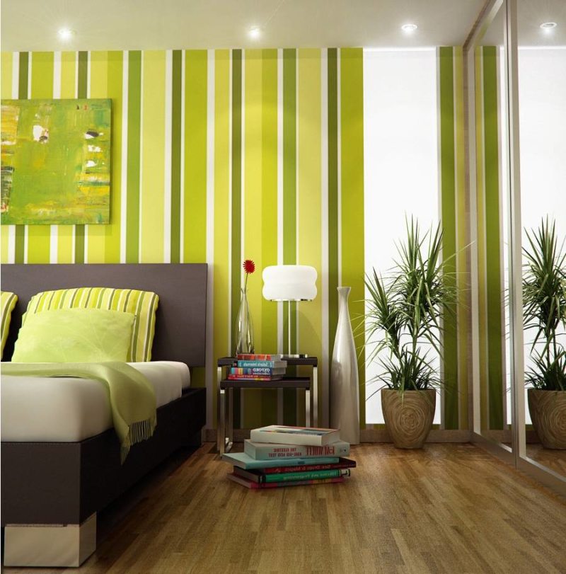 При оформлении стен нужно учесть одно правило: однотонные стены этого цвета смотрятся излишне ярко. Его нужно разбавить, добавив объемный рисунок, или дополнить другим цветом. Потолки в фисташковых тонах не оформляются, если только в качестве мелких вкраплений. Пол также можно декорировать различными вставками и рисунками этого цвета.