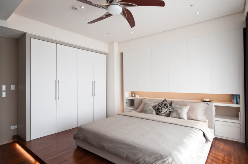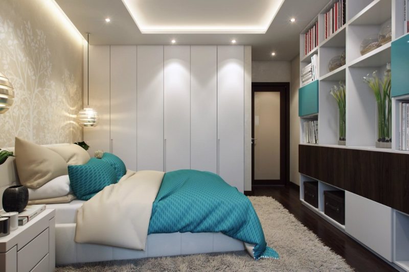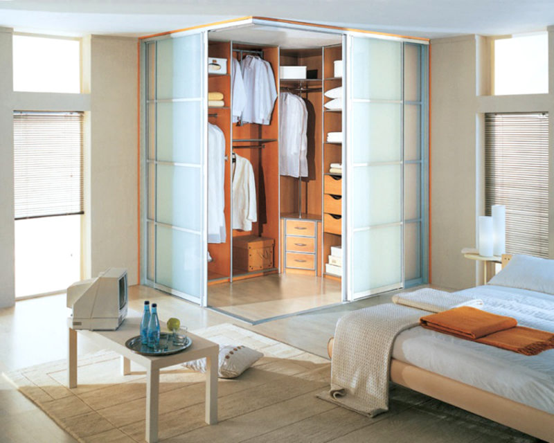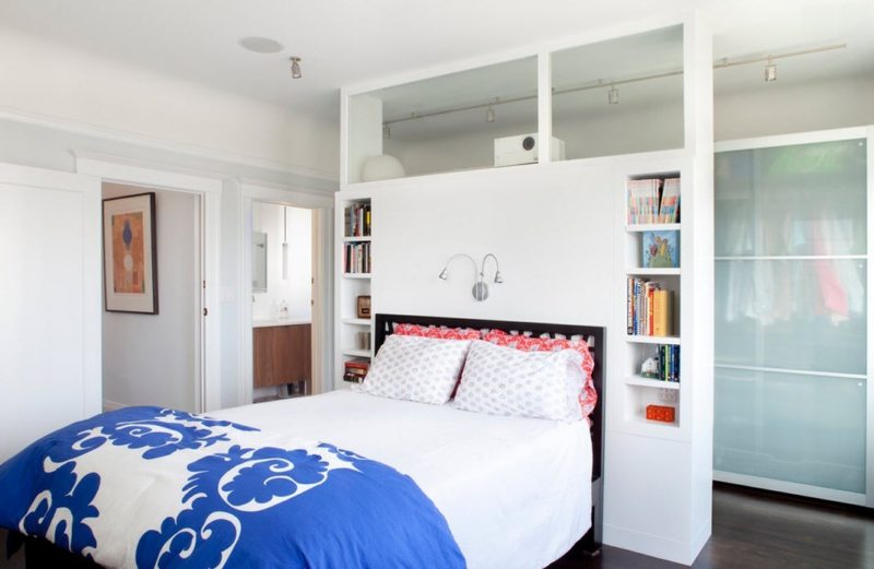 В узких, но вытянутых комнатах просто отгораживается часть спальни, в результате получается выровненная площадь. В квадратных комнатах устанавливают встроенный шкаф возле изголовья кровати, иногда с переходом на соседнюю стенку.