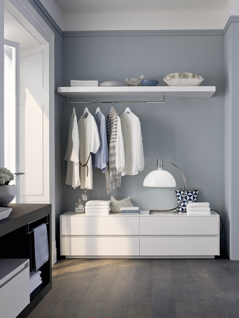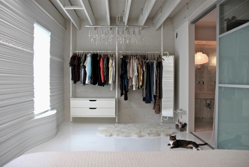От дверок даже из стекла необходимо отказаться. Все пространство, выделенное под гардеробную займут открытые полки и стеллажи, здесь так же уместно разместить мобильную вешалку. Таким образом, получилась небольшая гардеробная в спальне.