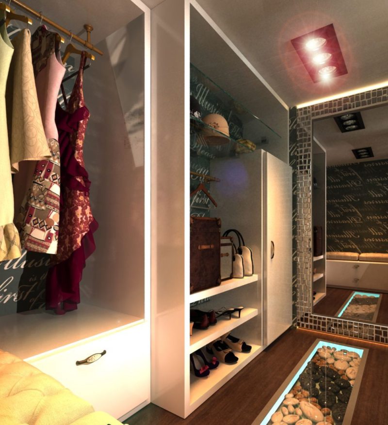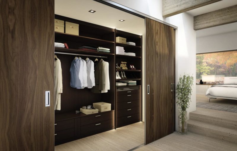Получившуюся таким образом конструкцию отделывают из нутрии всевозможными полочками, ящиками и подставками. Снаружи установив дверцы. В маленькой спальной комнате гардеробная тоже возможна, но только в очень урезанном варианте.