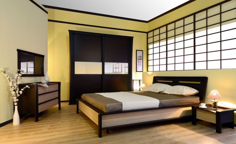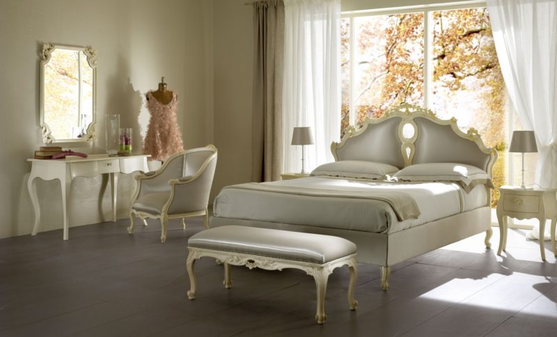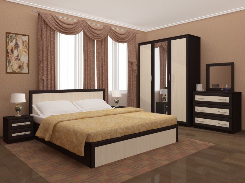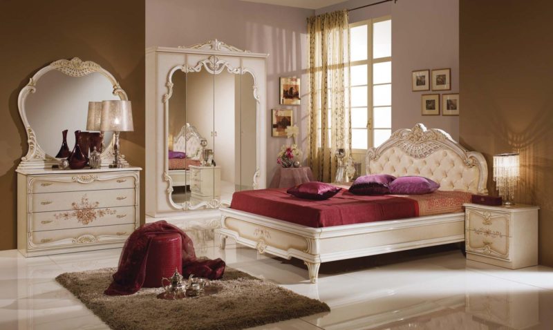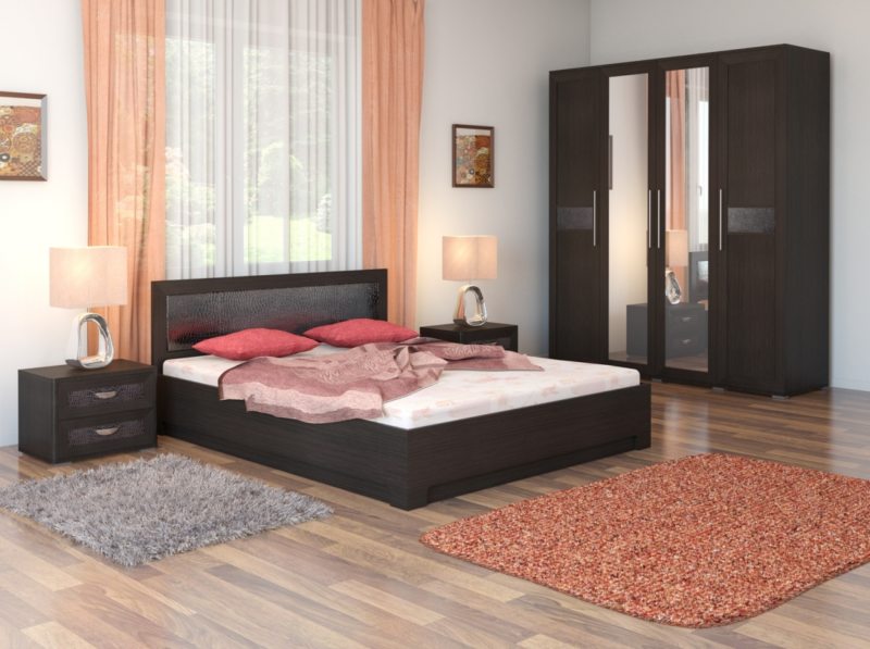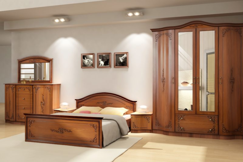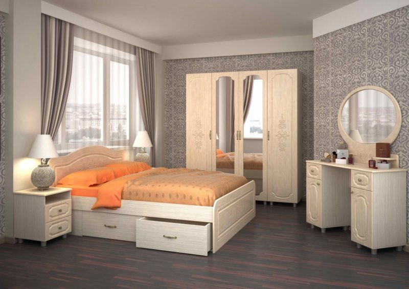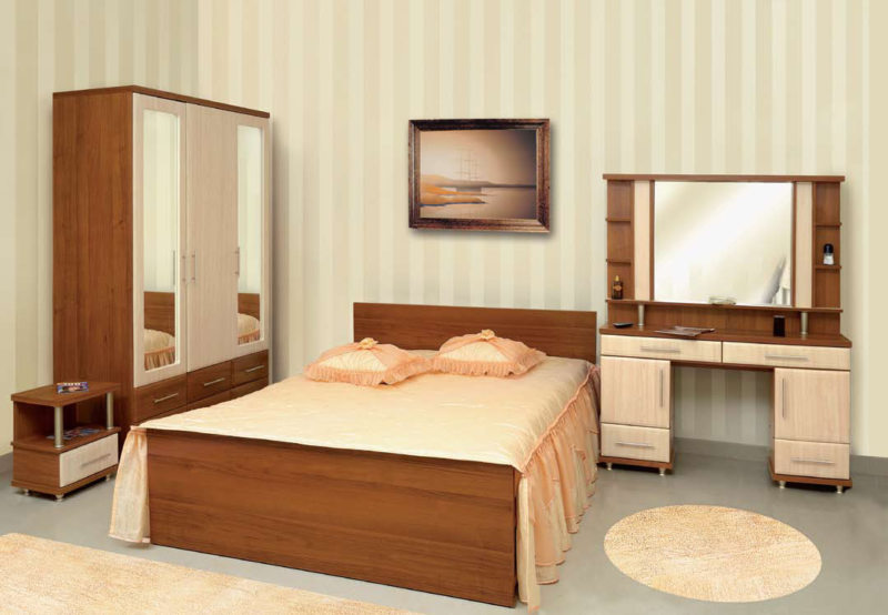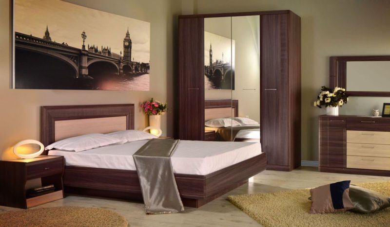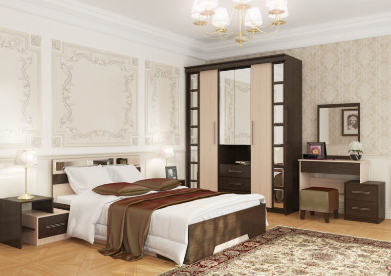 Спальный гарнитур состоит из нескольких элементов: шкафа, прикроватных тумб, комода и, самое главное, кровати. Если позволяет площадь помещения, добавляется туалетный столик.