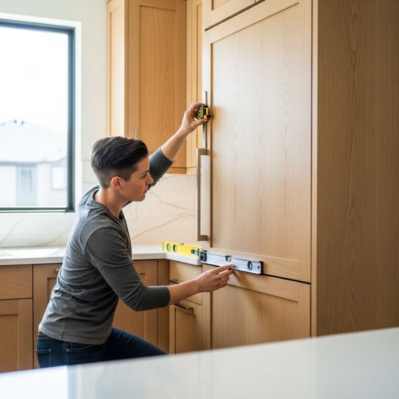 Проанализируйте трафик: дверца не должна перекрывать основной проход или мешать одновременному открыванию двери в комнату. Идеально, когда открытая дверца образует угол 90-135 градусов к рабочему треугольнику «мойка-плита-хранение».