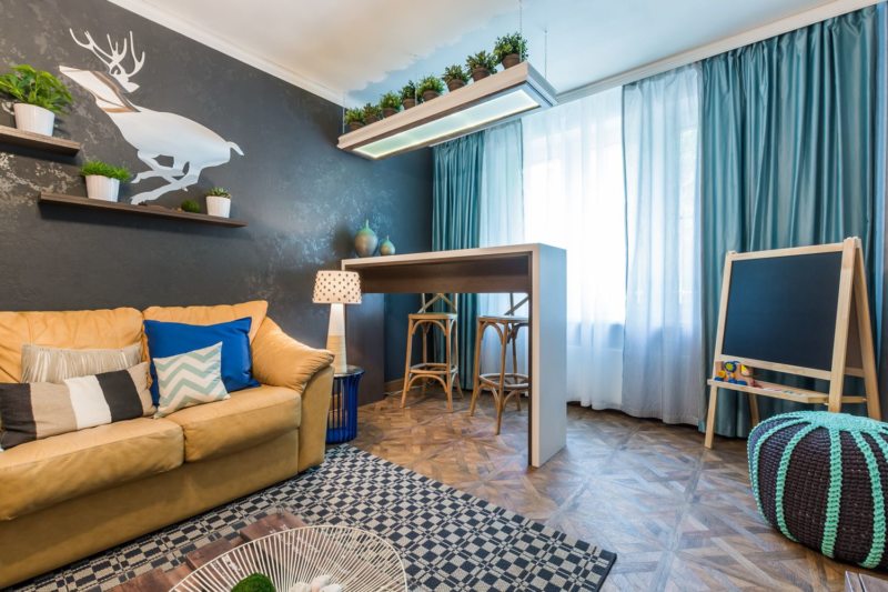 А вот комбинация с черным позволит акцентировать внимание на нестандартном вкусе хозяев. Однако необходимо быть осторожными и не перегрузить комнату темными элементами.