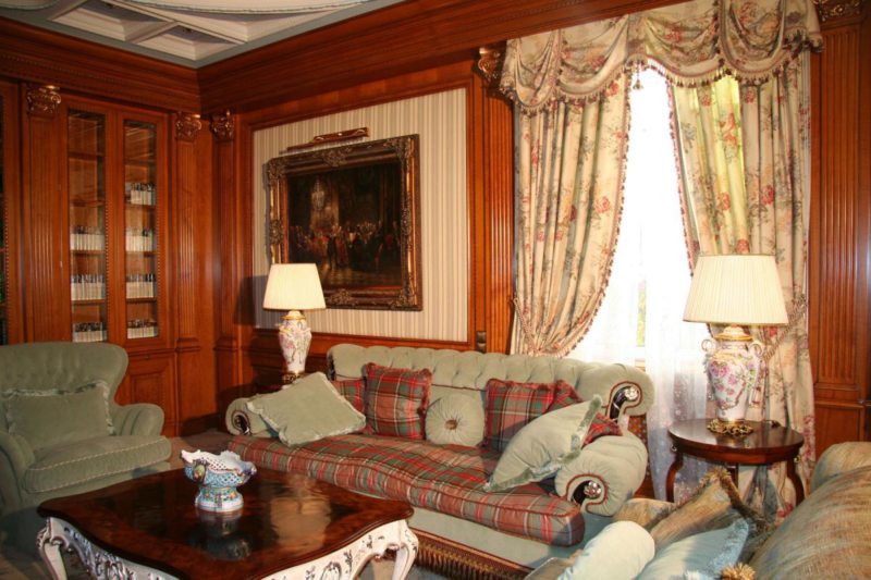 Шторы в первую очередь должно быть качественными. Бархат и парча – лучший выбор. Декорация штор производится бахромой, подхваты выполненными в виде широких полос, либо шнура с пышными кистями. Подвешивать шторы желательно на деревянный карниз.