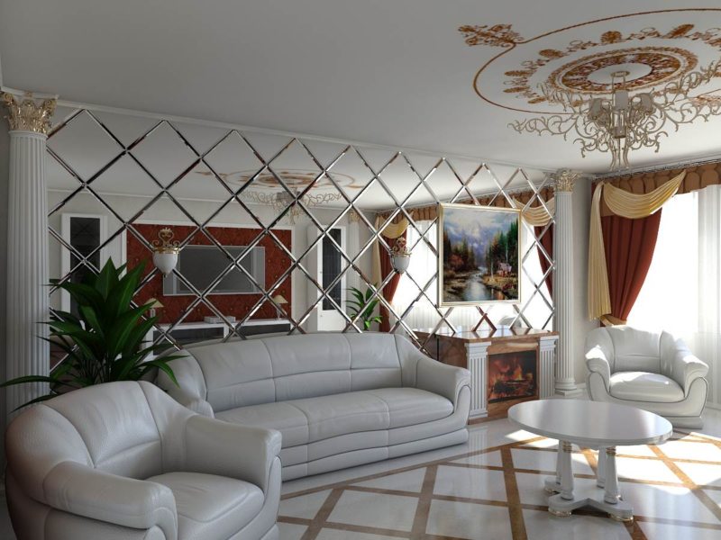 Комнату следует разделить на функциональные зоны. Обустройство начинается с центра гостиной, в котором размещают столик, а вокруг композиция из диванов и кресел.