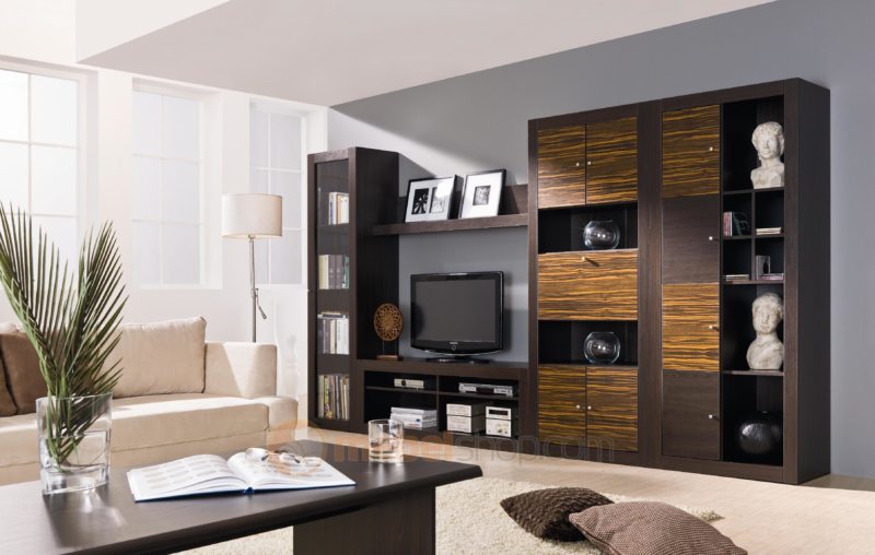 - мебельные предметы должны быть функциональными, поэтому следует отдать предпочтение трансформирующимся моделям. Стенку в гостиную в стиле модерн следует подбирать модульную и компактную;