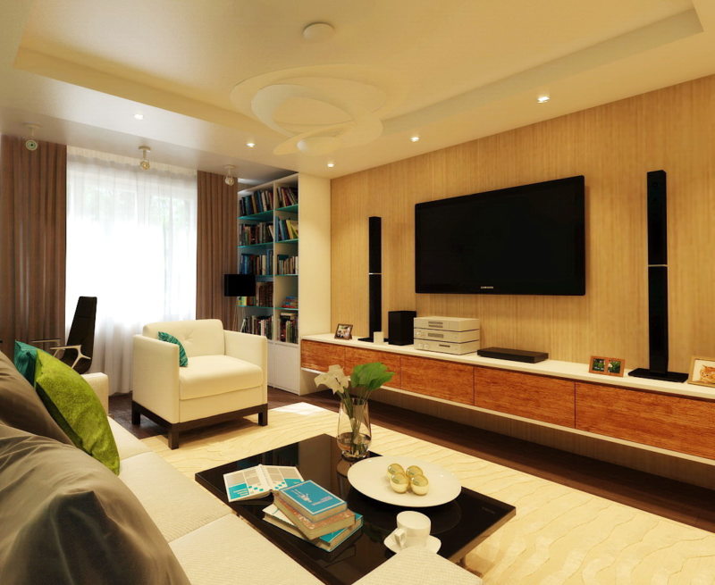 - В гостиной должно быть немалое количество современной техники. И чем больше размер этой техники, тем стилизованнее выглядит интерьер.