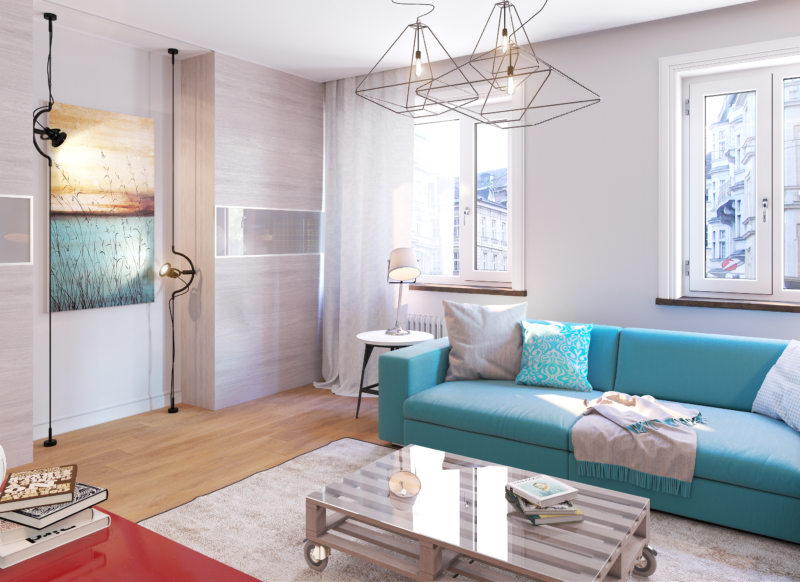 Если существует проблема низкого потолка, то стены неплохо будет оформить сочным цветом, потолок по-классически светлым, а пол — темным.