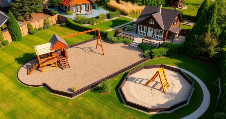 Отдельное внимание стоит уделить поверхности под игровым оборудованием. Желательно, чтобы это было мягкое покрытие: песок, резиновая крошка, искусственный газон или специально подготовленный слой мульчи. Твердые поверхности, такие как бетон или асфальт, категорически не подходят, поскольку они не смягчают падения.