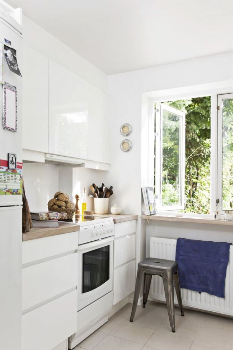 - Современный дизайн кухни состоит из простой базовой отделки. Не нужно тратиться на дорогой керамогранит. Подойдет обычная светлая краска. Двигаться стоит в направлении к белому, бежевому и светло-серому.