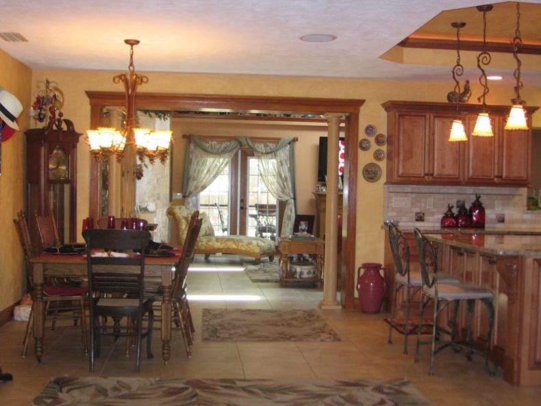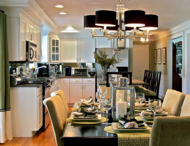 Если у Вас имеется большой загородный дом или коттедж, в нем спокойно можно обустроить большую и свободную столовую комнату. А благодаря большим площадям, кухню с гостиной можно очень легко объединить в единое помещение. В основном, для разделения двух зон используют барные стойки, стеклянные перегородки, арки, ширмы.