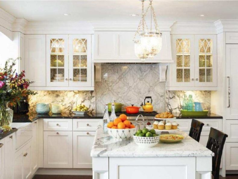 - При желании украсить стенку фотографиями в рамках, картинами или другими интересными аксессуарами, не вешайте их в центре внимания, как многие привыкли это делать. Например, оригинально будет повесить атрибут немного выше/ниже привычного местоположения. В таком случае все, кто будут приходить в Ваш дом, не так будут обращать внимание на то, какими размерами обладает пространство кухни. Отличный и оригинальный вариант – повесить одно изображение, а над/под ним – второе. Такой малозначимый нюанс позволит визуально увеличить высоту потолка.