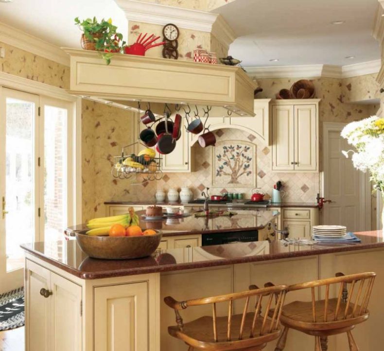 - Рисунки, то же касается и узоров, должны использоваться в кухнях деликатно. Как утверждают дизайнеры, в этом вопросе стоит сделать лишь штрихи. К примеру, используйте узоры на мебельной обивке, или же на подушках для декоративного оформления. В таком случае Вы не перегрузите пространство.