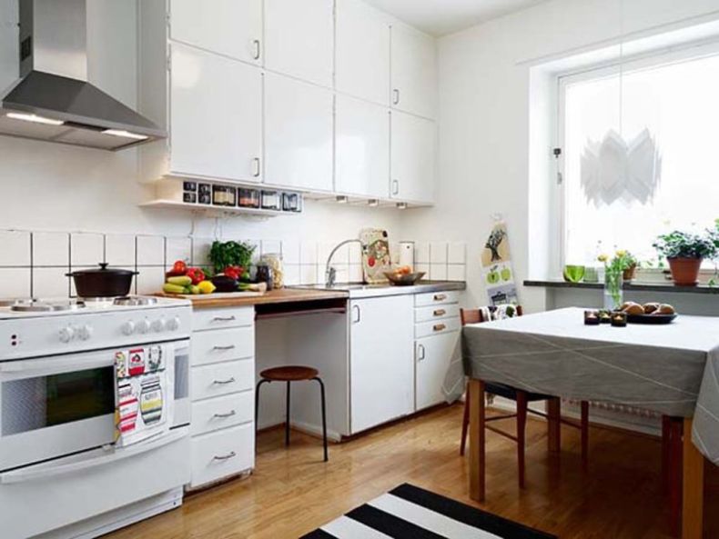 Характеризует оформление маленькой кухни основное правило, чем меньше всего использовать, тем лучше. Да, мебель должна быть по размерам побольше, но предметов не должно быть слишком много. Ну а, к примеру, если в комнате будет много мебели небольшого размера, оно будет выглядеть захламленным и загроможденным, словно здесь полнейший беспорядок. В результате помещение будет выглядеть даже еще меньше, чем оно есть в действительности.