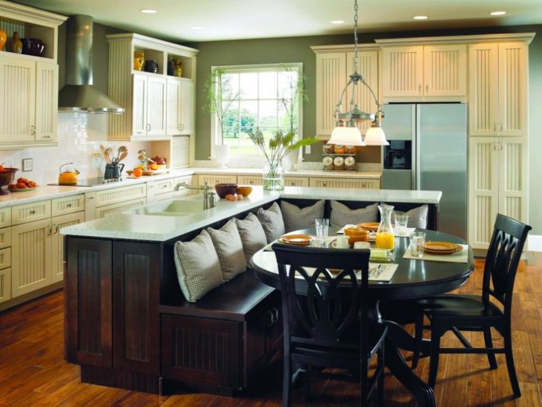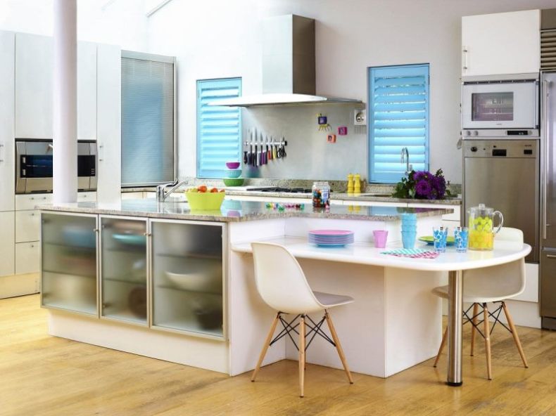 По сравнению с квадратной формой, в кухне меньше места займет вариант стола круглой формы. Также форма бывает и овальной. Если выбирать складной тип стола, или трансформер, так Вы сэкономите пространство при оформлении маленькой кухоньки. Кстати, такие столы могут быть использованы в качестве рабочих, а вся кухня может быть одновременно в качестве домашнего офиса.