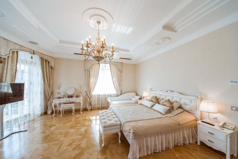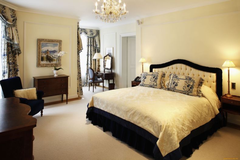 - Классический, для которого присуще оформление текстилем, кровати ставят больших размеров с изголовьями, приемлемо использование сложных форм с узорами, наличие богатства с роскошью, композиция должна быть единой.