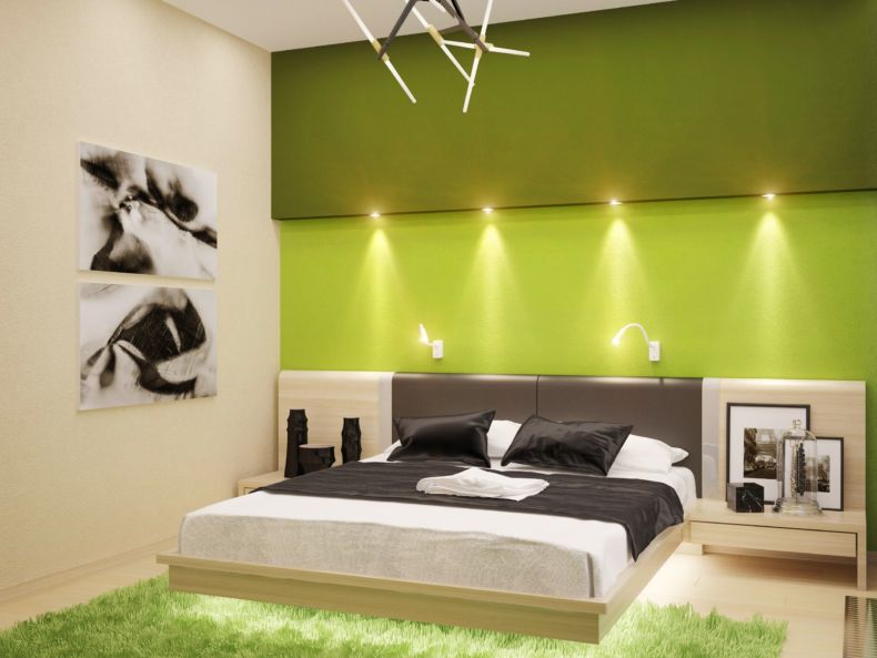 В спальне не стоит вешать люстру с торшерами, предпочтите встраиваемые варианты светильников. Так Вы сделаете пространство не слишком захламленным, при этом с легкостью можно будет регулировать освещение при необходимости.