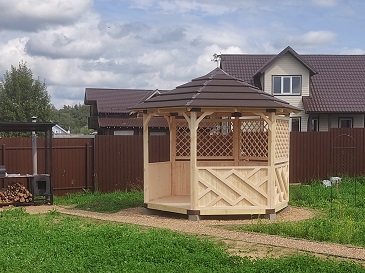 - Материал беседки и её стиль должны сочетаться с другими постройками на участке. Деревянная беседка отлично смотрится рядом с домом из бруса, а кованая металлическая — в саду с кованными скамейками и фонарями. Если участок оформлен в современном стиле, можно выбрать беседку с стеклянными стенами или лаконичным дизайном.