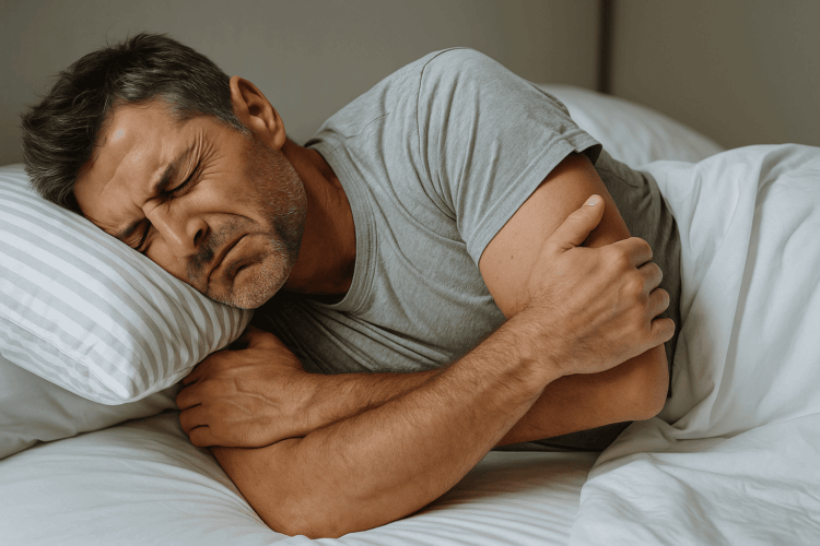 Сон на боку создает асимметричную нагрузку на организм. Верхнее плечо «заворачивается» внутрь, создавая напряжение в мышцах шеи и грудного отдела. Со временем это приводит к сутулости и болям в шее.