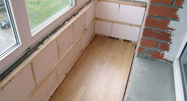 Утепление стен на балконе также осуществляется, начиная с гидроизоляции. Материалы используются те же, что и для пола. Затем выполняется обрешетка. Для этого применяются деревянные бруски. Они укладываются так, чтобы расстояние между ними было равно ширине теплоизолятора. Высоту следует подбирать, учитывая ширину утеплителя.
