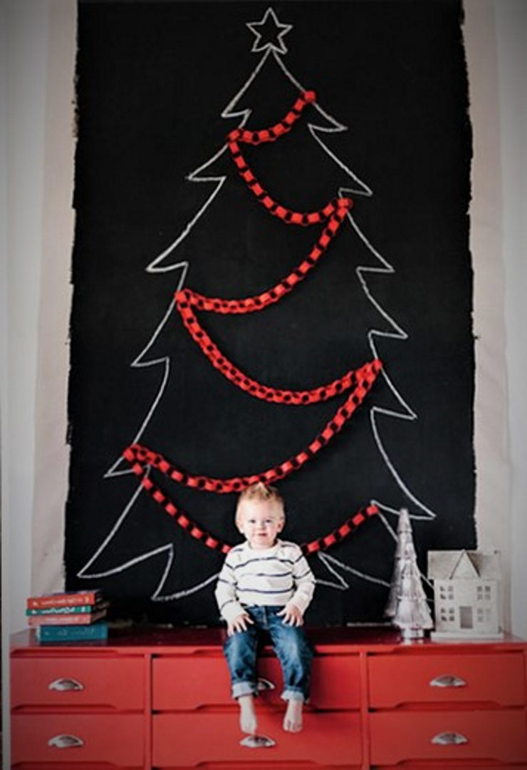 Если есть меловая стена – просто нанесите очертания, и поставьте под нее бутафорские подарки. Также можно украсить стену гирляндами, повторяя очертания ели.