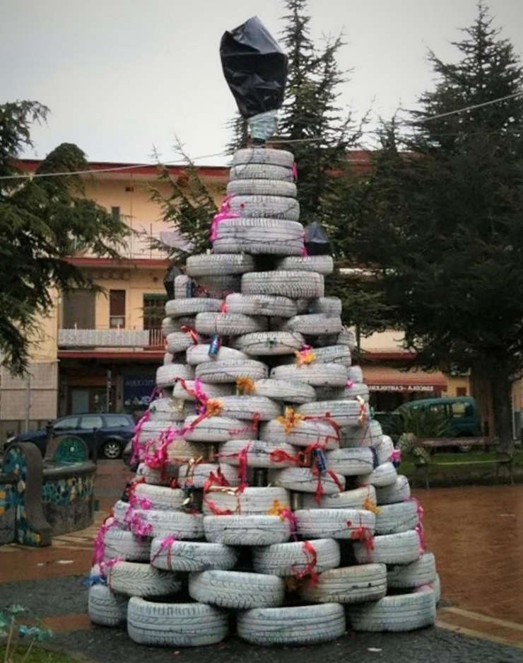 - Шиномонтажники также не отстают. Для них есть такая дизайнерская нарядная елочка из покрышек, как на фото.