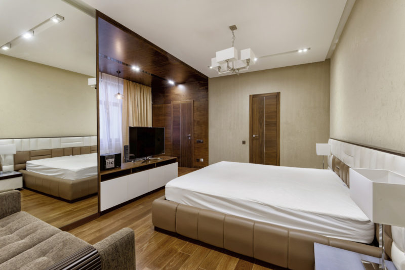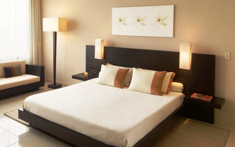 Классика жанра — бежево коричневая спальня. Если нужно разнообразие, то может быть добавлен яркий акцент.