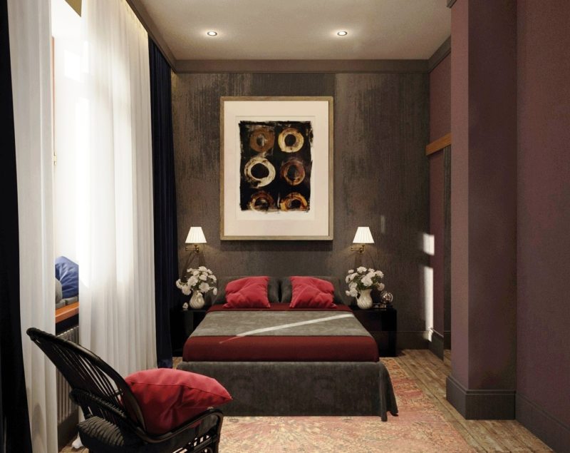 Для того стоит учитывать размеры спальной, чтобы не сузить ее «цветом». С той же целью служит и освещение, чтобы немного расширить комнату, визуально, чтобы в ней было комфортно. Стены темного цвета плохо отражают свет.
