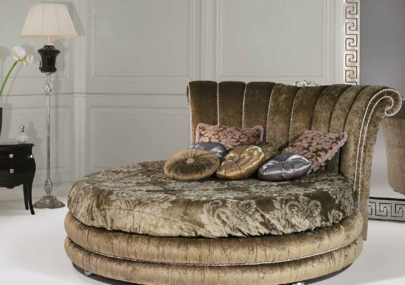Для классического дизайна круглой кровати в спальне с большим подголовником эффектны серо-голубые оттенки кресел, круглой кровати и пуфика с красивым орнаментом выглядят торжественно и помпезно. Комплект постельного белья, идеально подобранный по тону, будет составлять законченный ансамбль.