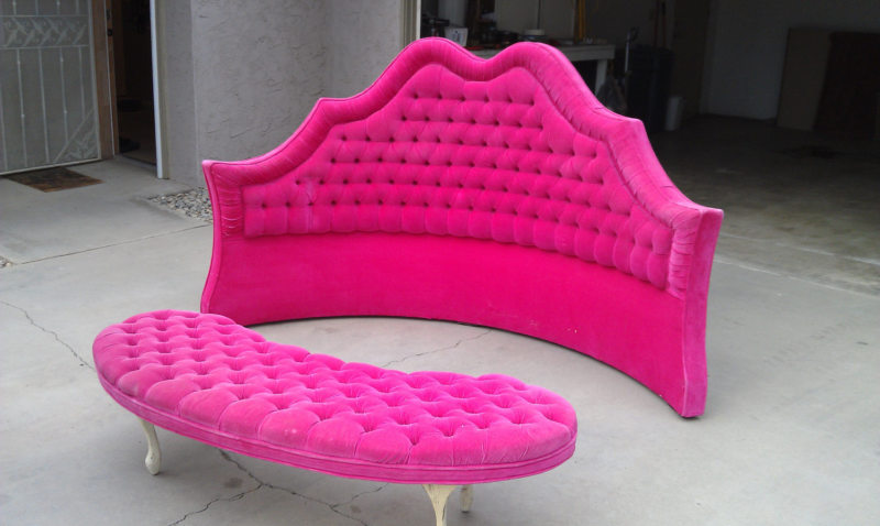 Рядом можно поставить комод, пуфик и тумбочки. Плавные формы изголовья сочетаются с мягкими формами ножек стульев и комода. Мягкий рассеянный свет дополнит общий образ. Сиреневый цвет должен присутствовать на подушках.